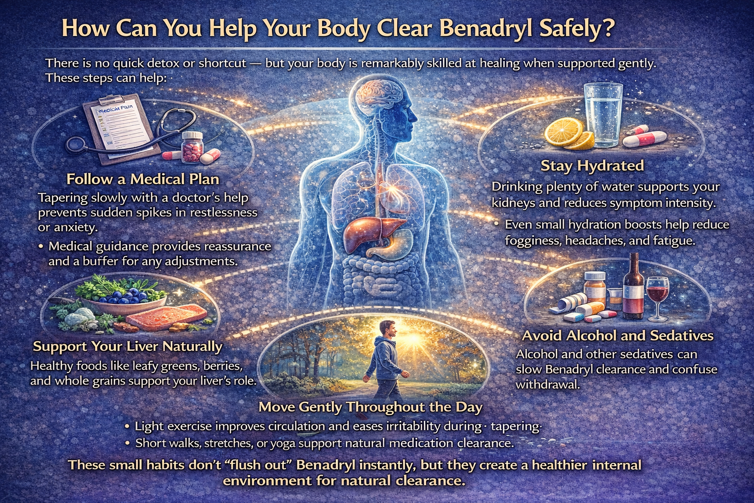 Your general well-being — including your hydration, sleep pattern, emotional state, and daily stress — profoundly influences how the body handles Benadryl. Dehydration slows kidney filtration, making clearance less efficient.