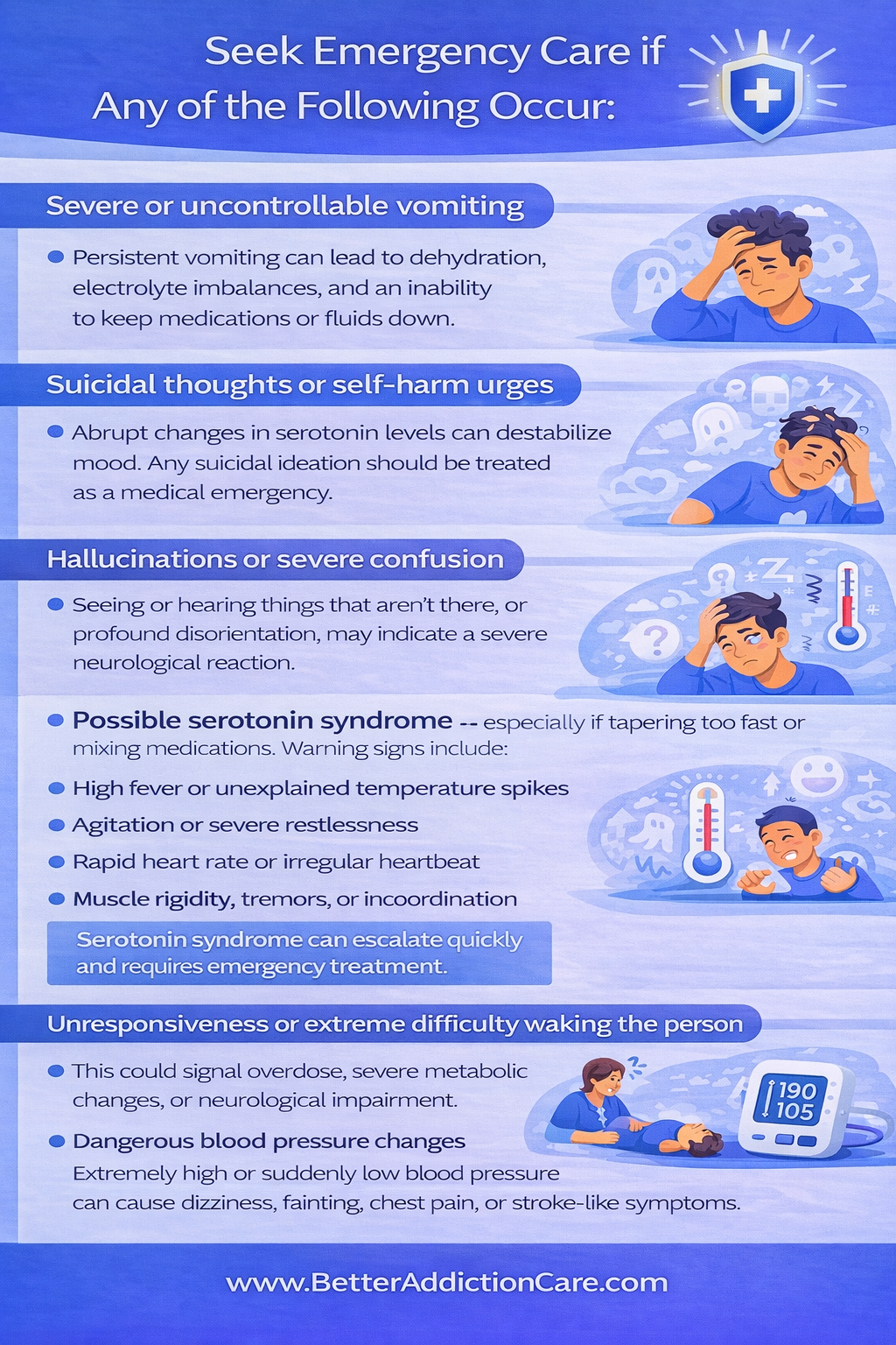 Suicidal thoughts or self-harm urges: Abrupt changes in serotonin levels can destabilize mood. Any suicidal ideation should be treated as a medical emergency.