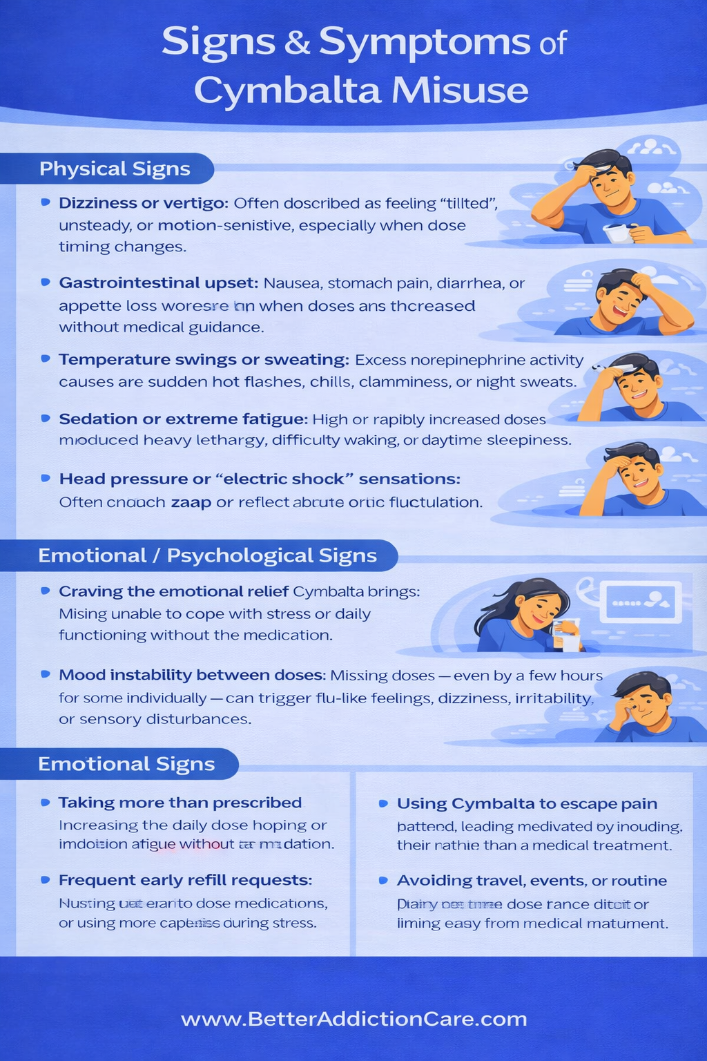 Misuse: Cymbalta misuse is different from addiction. It means using the medication in ways not prescribed:
