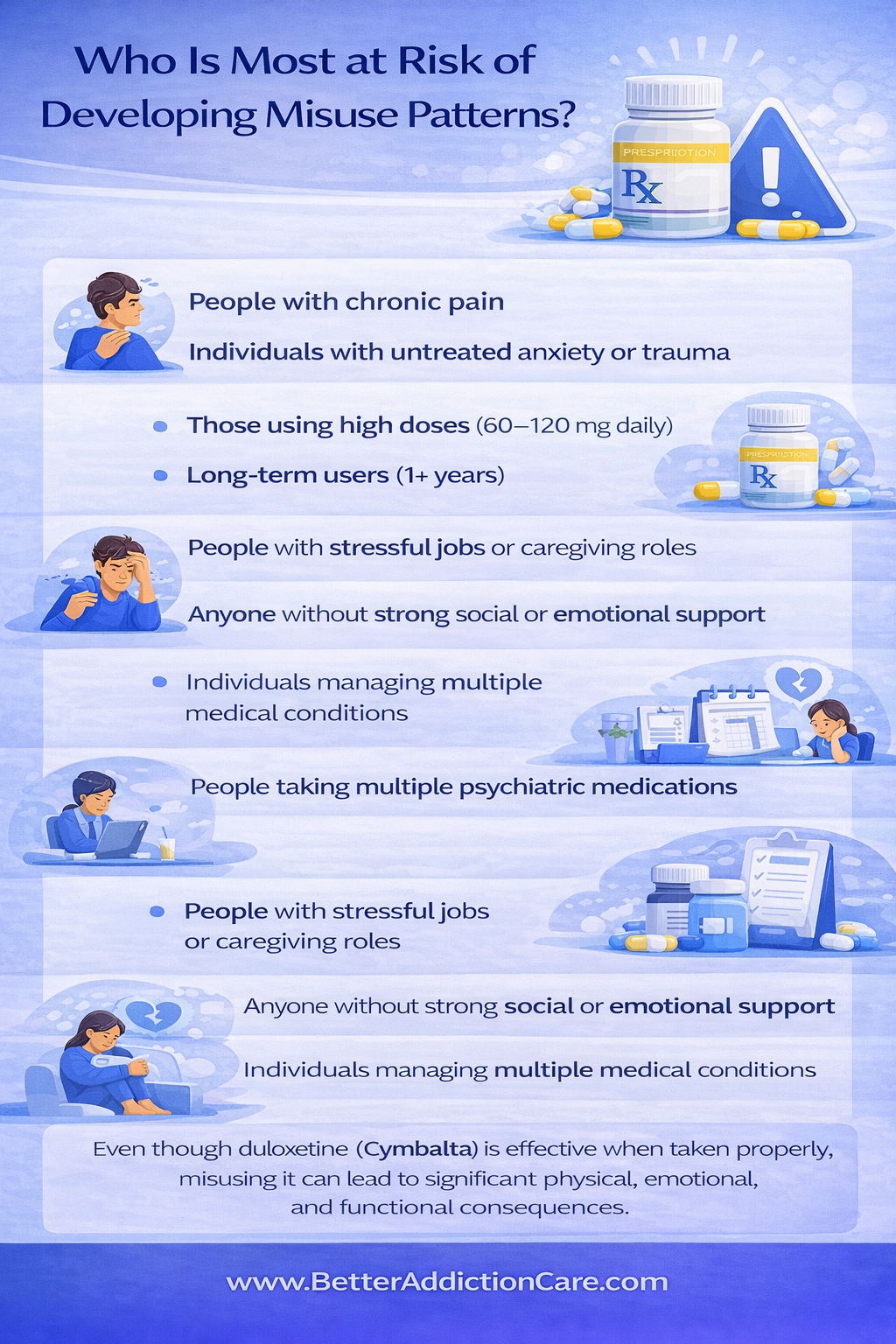 People with these vulnerabilities may find Cymbalta’s emotional or physical relief especially reinforcing. Over time, they may start relying on the medication more heavily during stress, leading to dose escalation or psychological dependence.