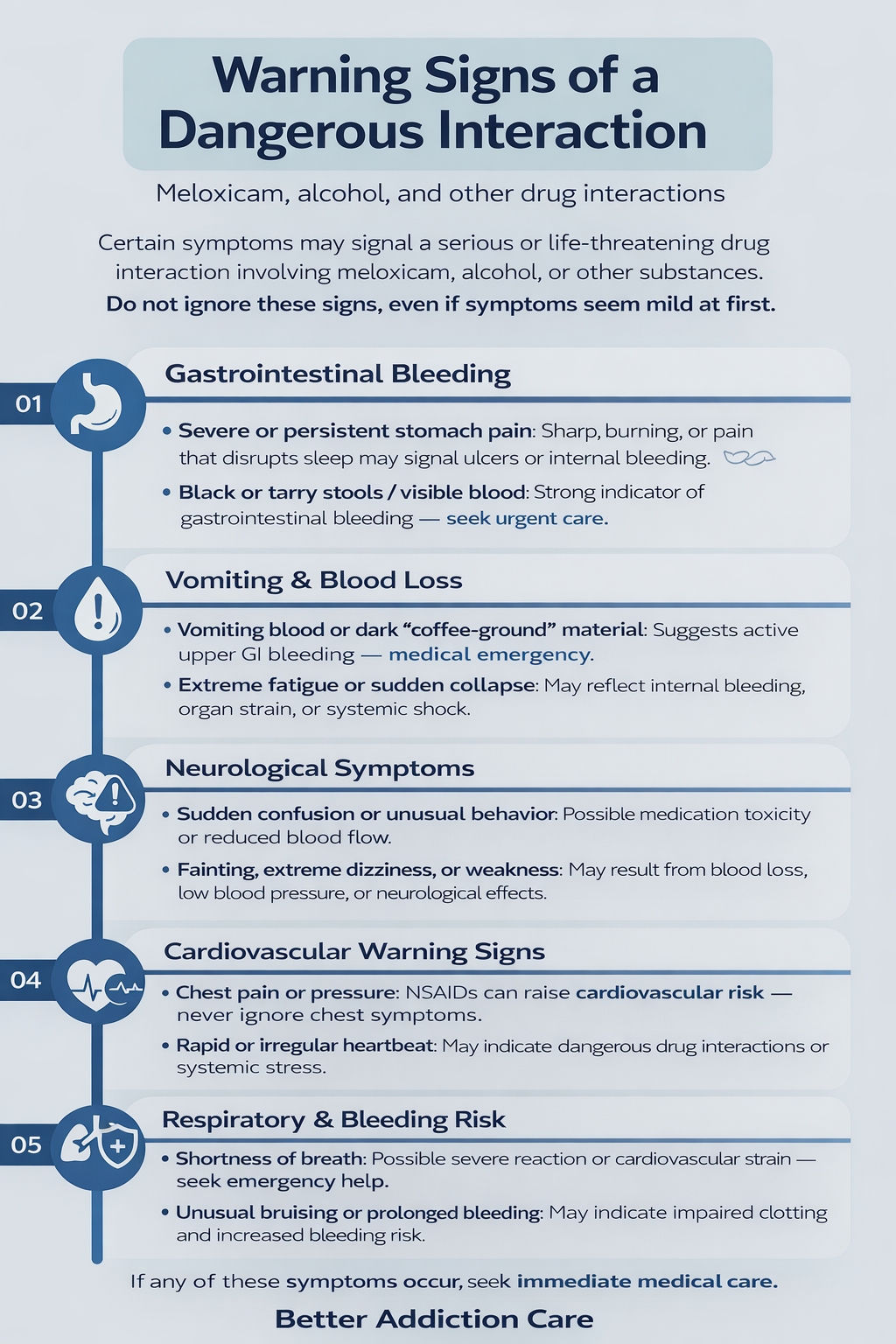 Certain symptoms may signal a serious or life-threatening interaction involving meloxicam, alcohol, or other substances. These signs should never be ignored, even if the medication has been taken before without problems or the symptoms seem mild at first. Early recognition and prompt medical care can prevent severe complications.