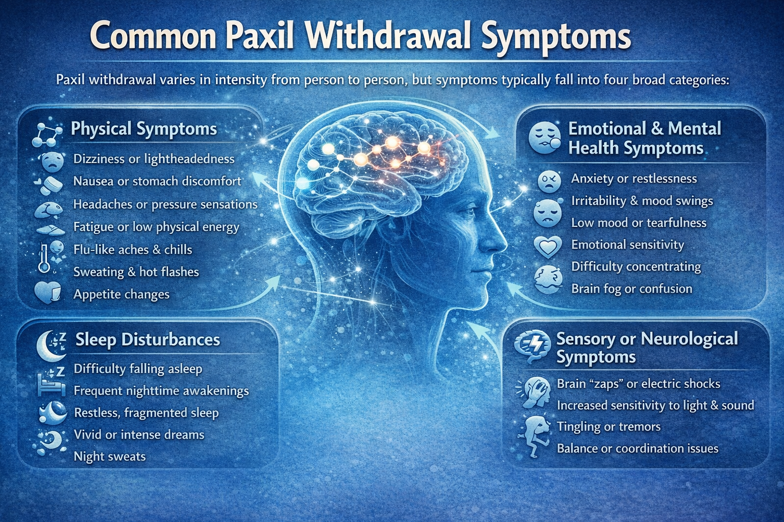 Paxil withdrawal varies in intensity from person to person, but symptoms typically fall into four broad categories. Each category reflects specific neurochemical adjustments taking place as serotonin signaling gradually rebalances during tapering.