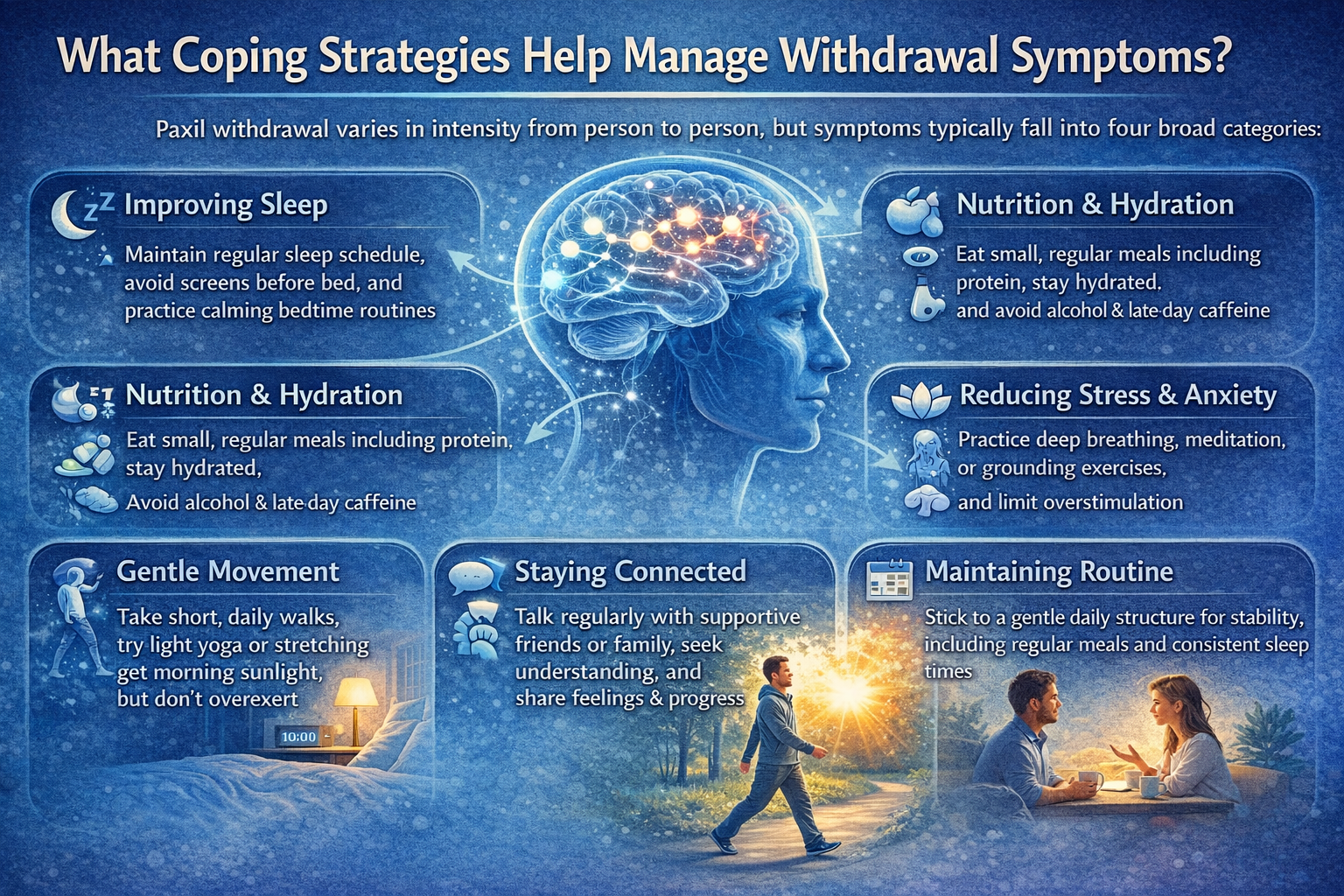 Sleep disruption is common during Paxil withdrawal, so focusing on gentle sleep support can make a meaningful difference. Try to go to bed and wake up at the same time each day to help reset your body clock.
