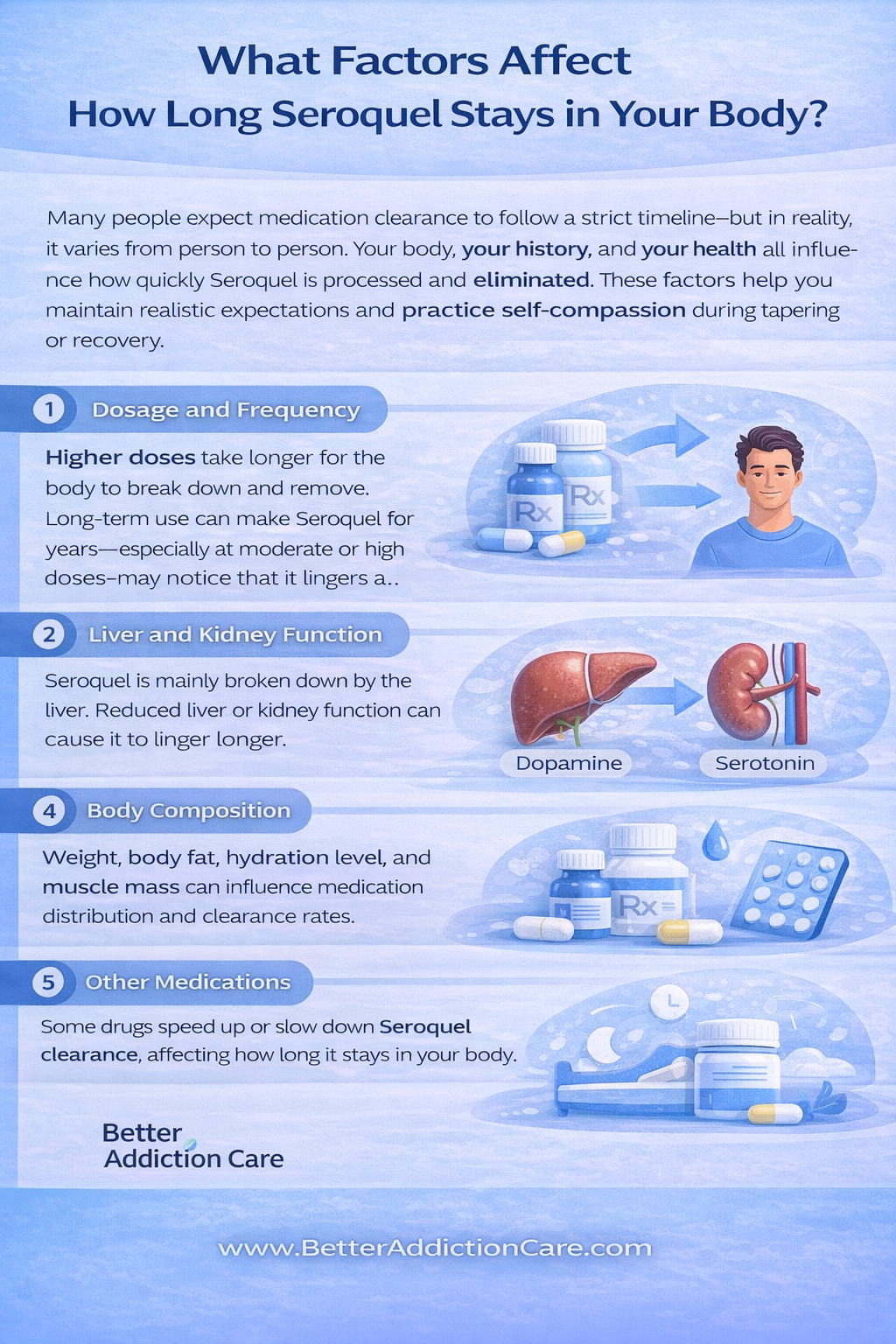 Many people expect medication clearance to follow a strict timeline—but in reality, it varies from person to person. Your body, your history, and your health all influence how quickly Seroquel is processed and eliminated. These factors help you maintain realistic expectations and practice self-compassion during tapering or recovery.