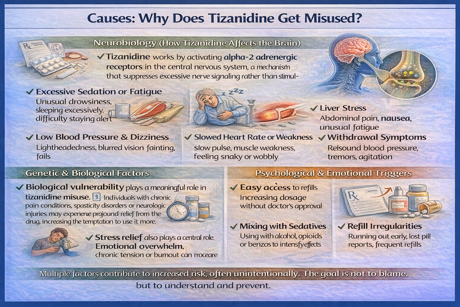 Biological vulnerability plays a meaningful role in tizanidine misuse. [5] Individuals with chronic pain conditions, spasticity disorders, or neurologic injuries may experience profound relief from the drug, increasing the temptation to use it more frequently or at higher doses.