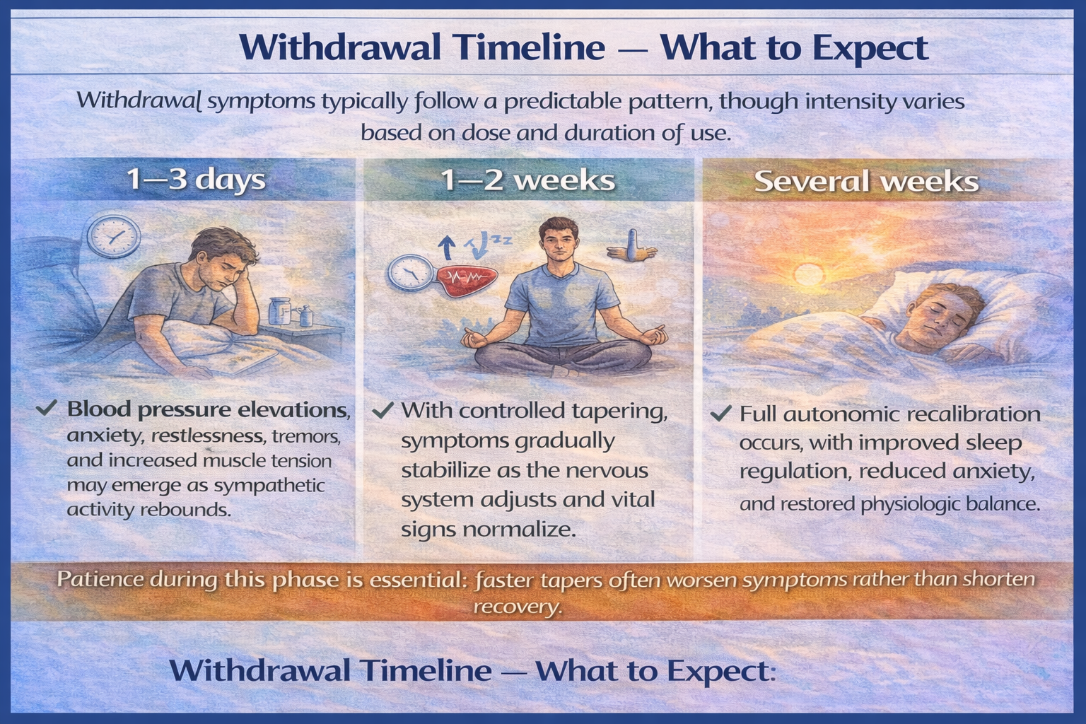 1–2 weeks: With controlled tapering, symptoms gradually stabilize as the nervous system adjusts and vital signs normalize.