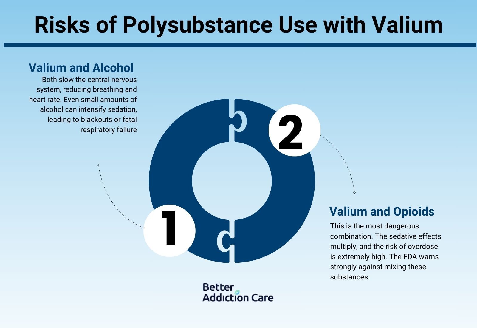 Combining Valium with alcohol, opioids, or other sedatives greatly increases the risk of overdose, slowed breathing, and even death. This combination should be avoided entirely.