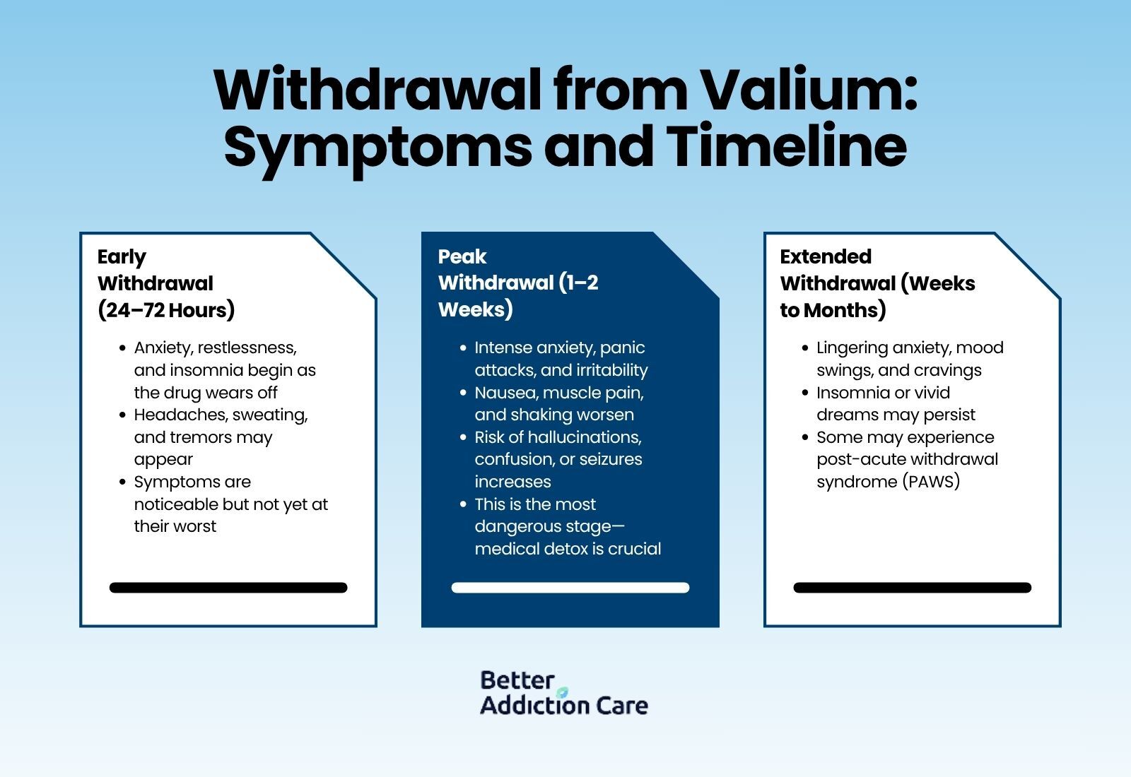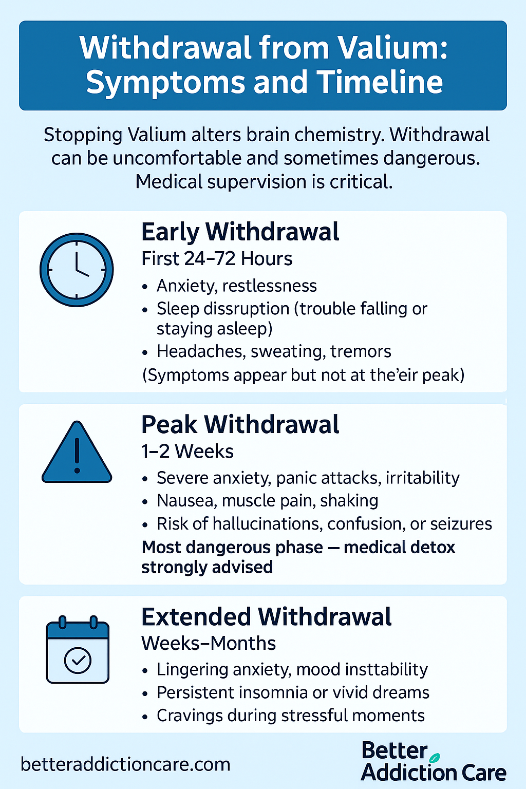 Valium withdrawal typically begins within days, peaks in the first two weeks, and gradually lessens over time. With medical supervision, the process is safer, more manageable, and less frightening for both individuals and their families.