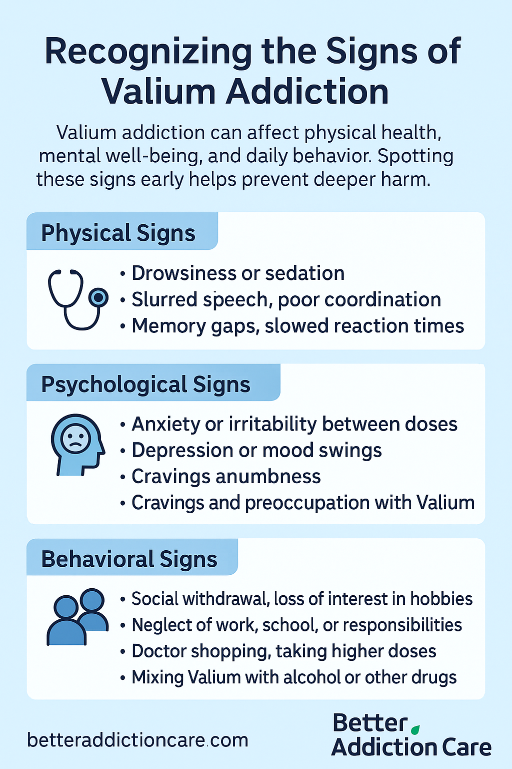 Doctor shopping—seeking multiple prescriptions, or taking higher doses than prescribed, are red flags. In severe cases, individuals may combine Valium with alcohol or other drugs, greatly increasing the risk of overdose(2).
