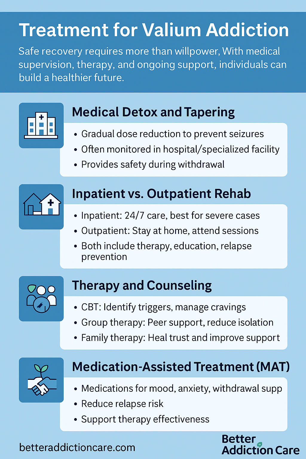 The first step is usually detox. Unlike many drugs, Valium cannot be stopped suddenly without serious risks. Medical professionals use a tapering process, gradually lowering the dose to reduce withdrawal symptoms and prevent seizures (5).