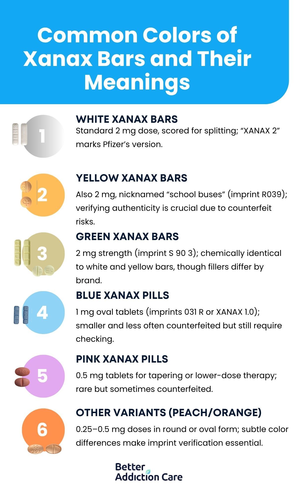 Accurate identification protects against dangerous mistakes. Xanax pills come in different colors, shapes, and strengths, but the imprint code is the only foolproof way to confirm authenticity. Counterfeit pills are widespread and often mimic the look of real bars, making imprint checks and pharmacy verification essential for safety.