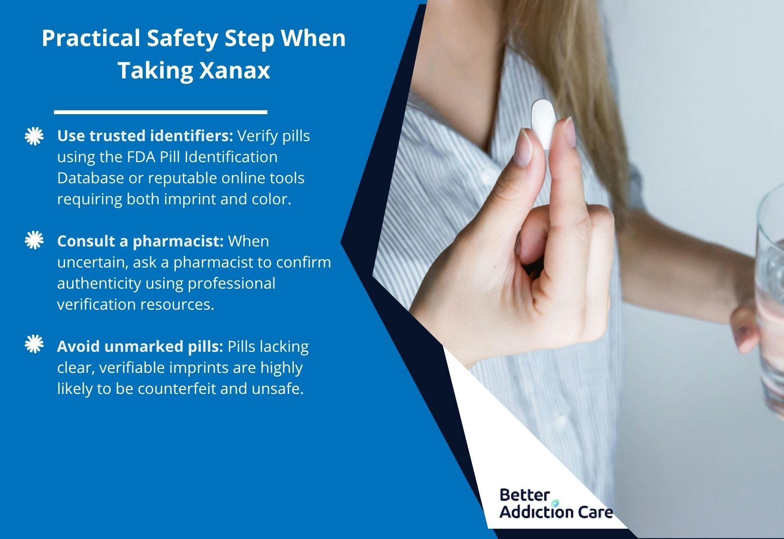 Counterfeit danger: Illegally manufactured “Xanax” often looks similar but may contain fentanyl or other dangerous substances, making correct identification literally life-saving [1].